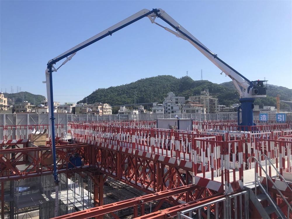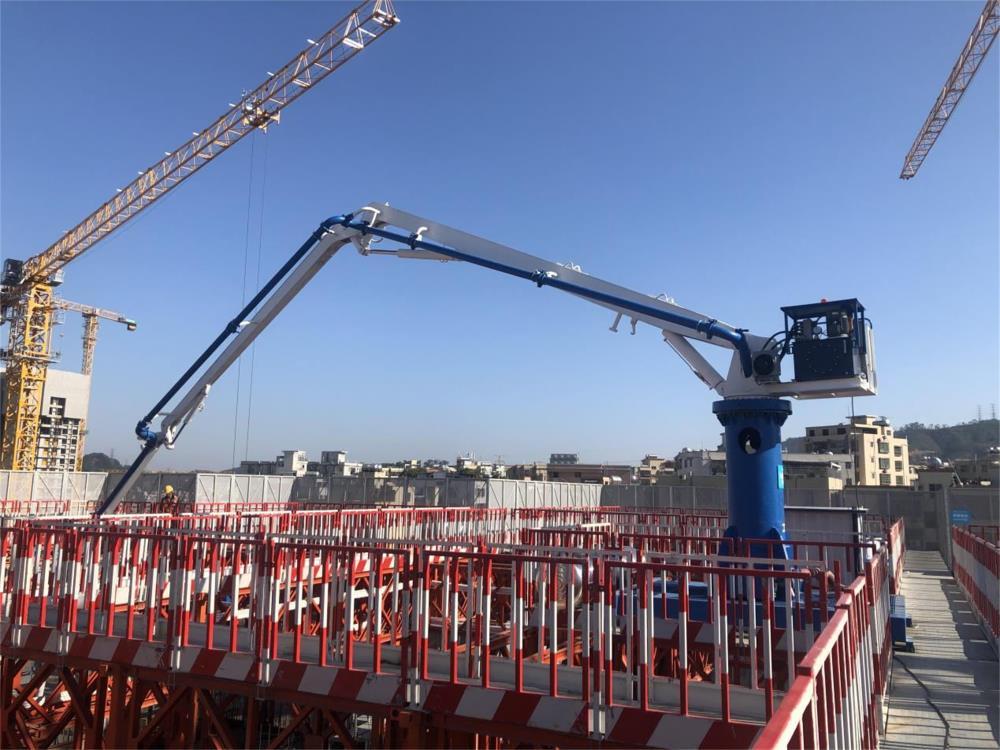 模架式液壓混凝土布料機自帶鋼平臺底座,與爬模架體連接傳遞施工載荷,無需自帶動力系統(tǒng),爬模爬升時帶動其爬升。其中HGY21模架式液壓混凝土布料機于2021年11月成功應用在使用“住宅造樓機”的裝配式建筑領(lǐng)域(中建三局承建的廣州大源村項目)。