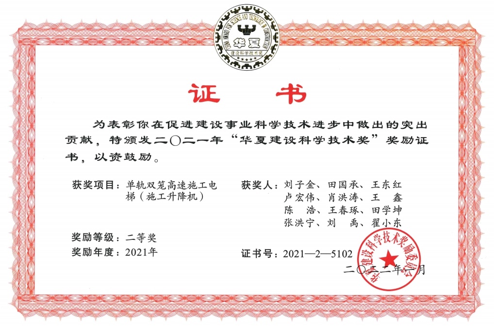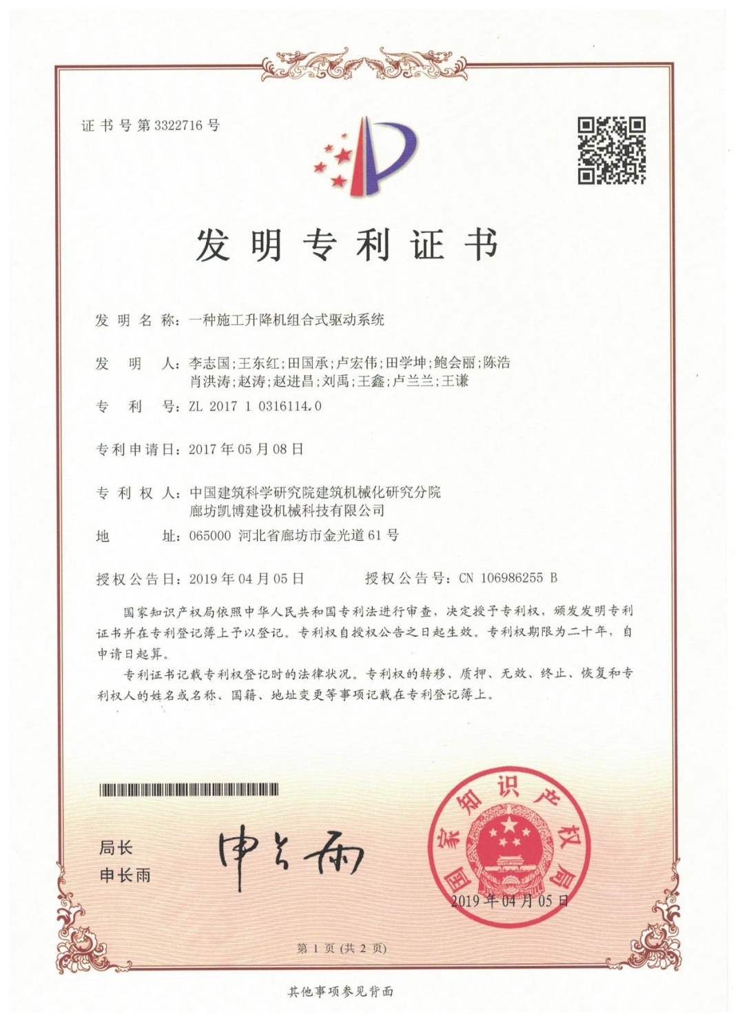 ? ? ? ? ? 本產(chǎn)品獲2項發(fā)明專利——施工升降機組合式驅(qū)動系統(tǒng)(專利編號:ZL201710316114.0)和手動離合增力矩裝置(專利編號:ZL201610933946.2);主編參編GB/T37537-2019《施工升降機安全監(jiān)控系統(tǒng)》、GB/T 26557《吊籠有垂直導(dǎo)向的人貨兩用施工升降機》兩項國家標(biāo)準(zhǔn);2021年榮獲“華夏建設(shè)科學(xué)技術(shù)獎”二等獎。為解決我國超高層建筑人員物料垂直運輸?shù)母咝О踩椒€(wěn)運行難題提供了強有力的技術(shù)支撐。