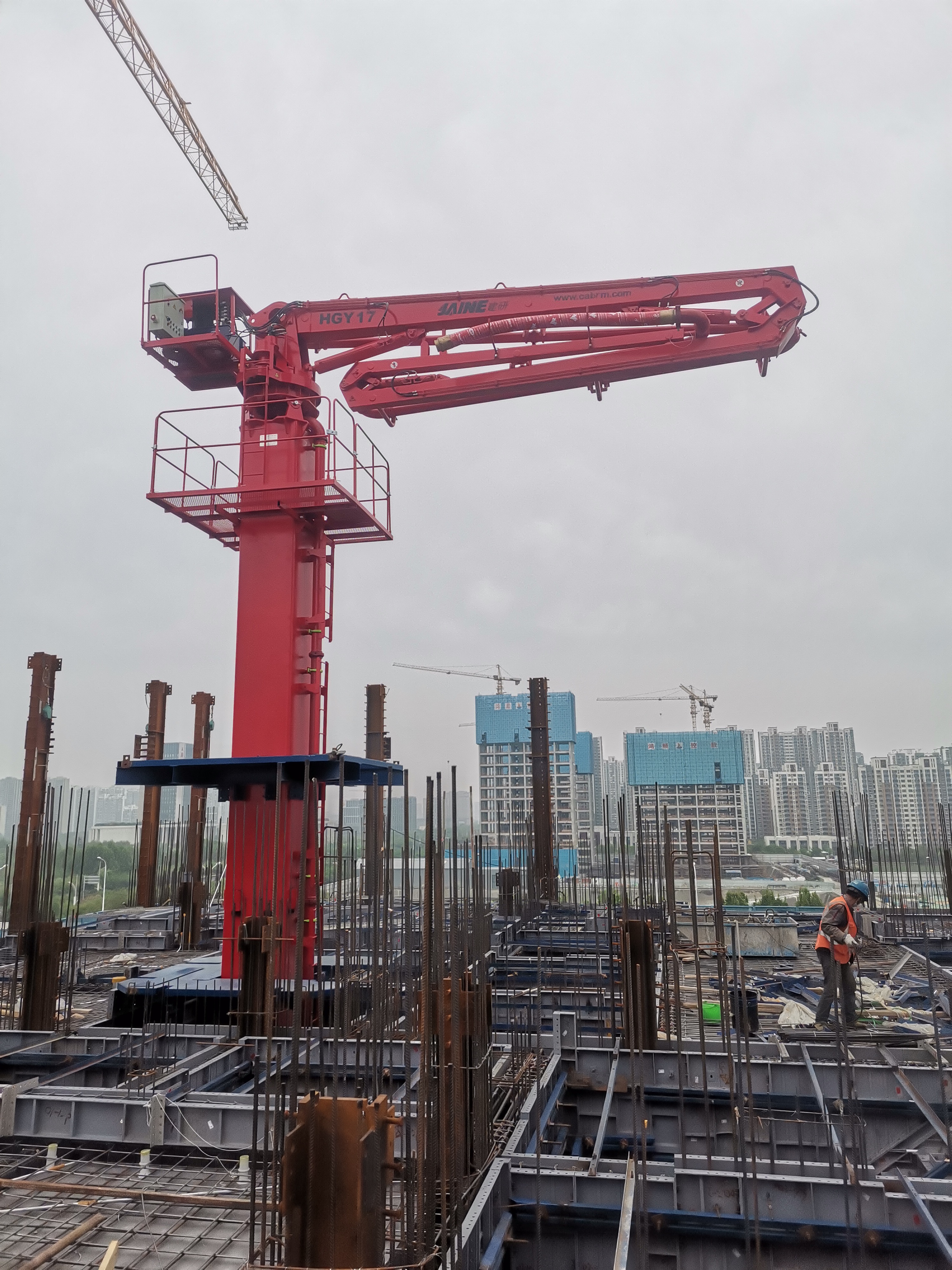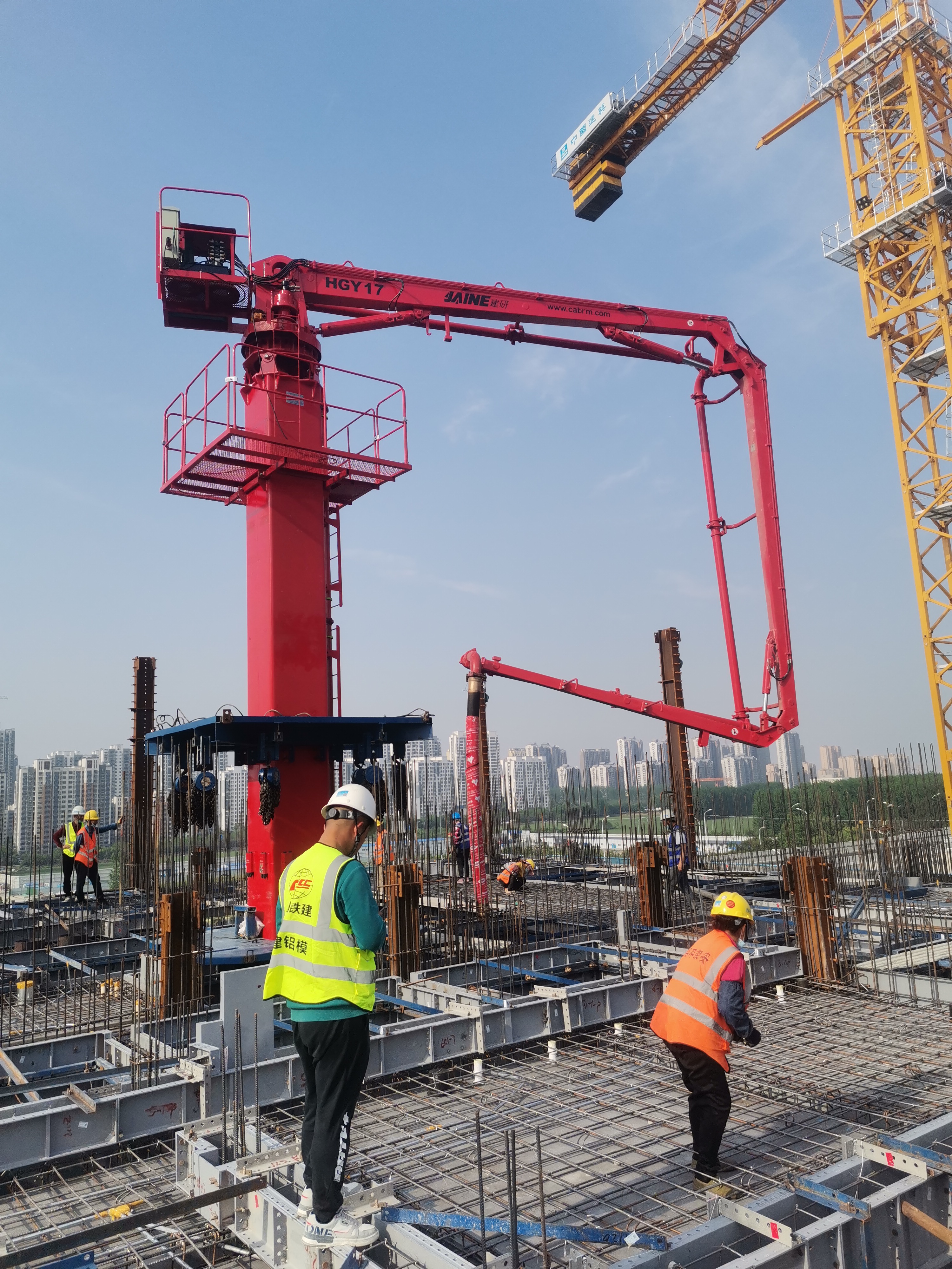 JAINE建研?內(nèi)爬式布料機適用于高層建筑施工,塔身固定在電梯井或者樓板預留孔內(nèi),可利用爬升框架和液壓油缸的頂升動作在樓層間爬升,使布料機隨著施工層面的升高而升高。