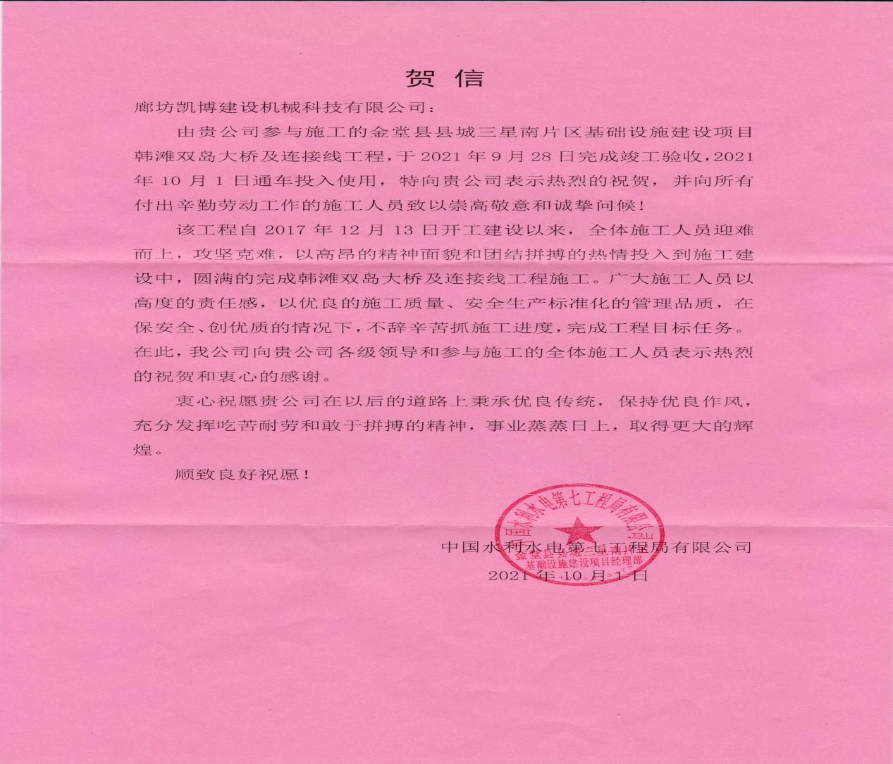 中國(guó)水電七局邀請(qǐng)我公司參加了金堂大橋的通車儀式、贈(zèng)送紀(jì)念品,并專門(mén)發(fā)來(lái)賀信,對(duì)我公司在項(xiàng)目合作中的支持配合與辛勤付出表示衷心感謝。